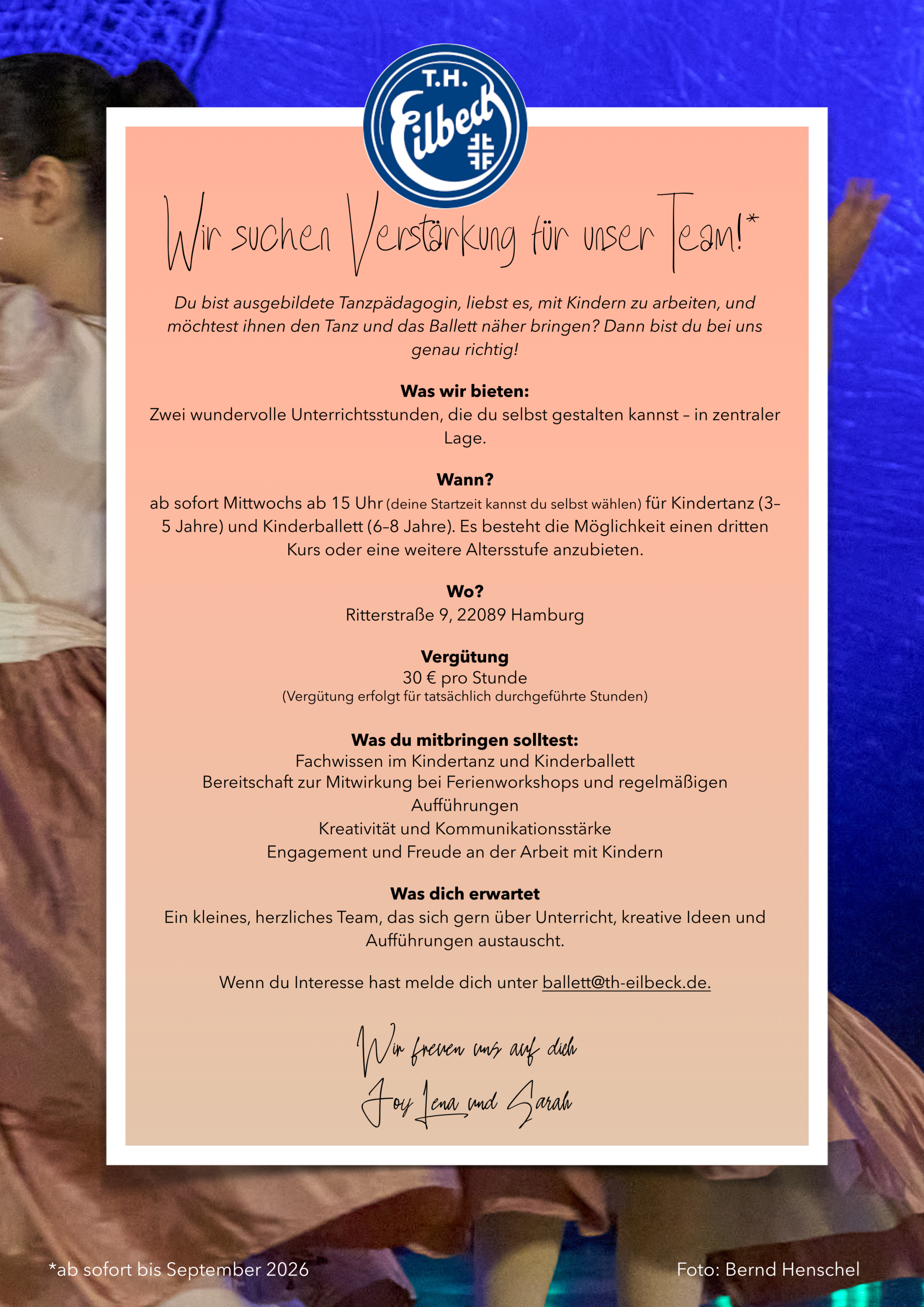 Du bist ausgebildete Tanzpädagogin, liebst es, mit Kindern zu arbeiten, und möchtest ihnen den Tanz und das Ballett näherbringen? Dann bist du bei uns genau richtig!